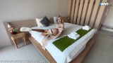 Couple on vacation shower together & wash each other, cute blonde gives best blowjob and handjob