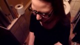 Nerdy librarian with glasses loves to drink piss