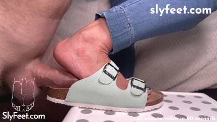 Green Birkenstocks footjob with a huge cumshot on them