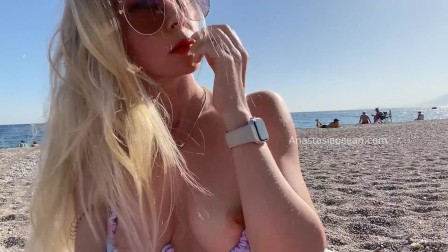 Sexy blonde bares her beautiful breasts and elastic ass on a public beach.
