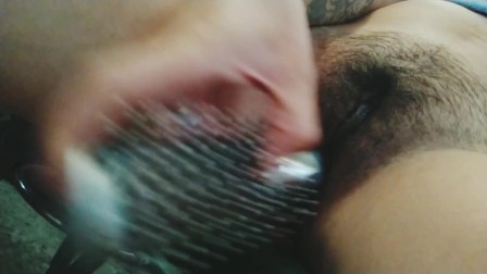 Me masturbo en la sala con un cepillo hasta que me vengo a chorros
