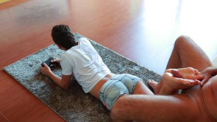 Gamer girl multitasks! Playing NFS and make Footjob at the same time