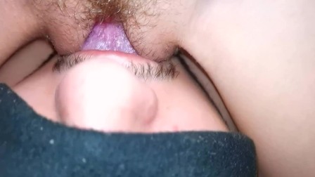 The wife moans from cunnilingus, close-up, sitting on her face with a wet pussy.
